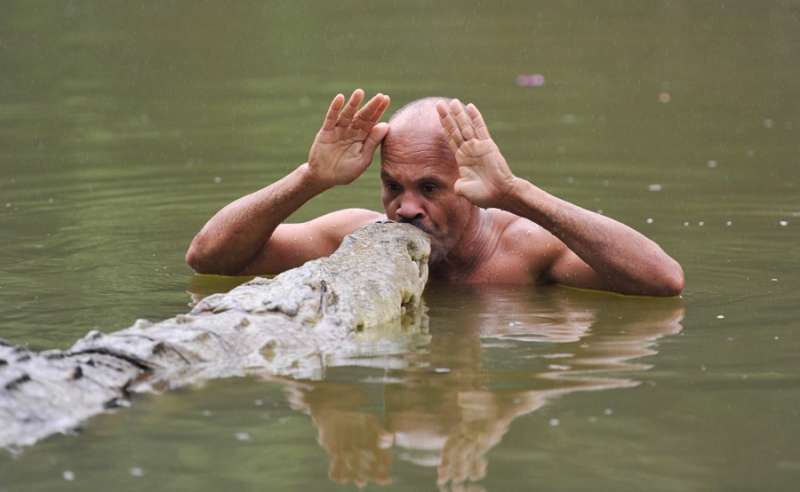 ▼Chito表示:「當時我就想,鱷魚是可能被馴服的。」獲得政府的同意後,Chito開始在水中訓練Pocho。Pocho越長越大,與Chito的感情更加親密,牠有時候還會翻著肚子向主人撒嬌。