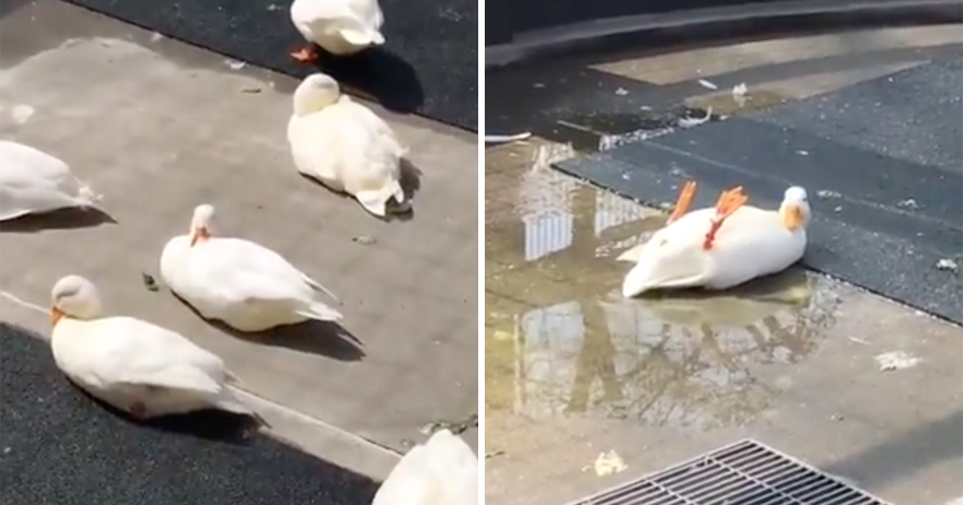 ▼從推主拍攝的影片可以看到,其他鴨鴨都正常地蹲在地上曬太陽,只有一隻鴨鴨是異類。牠不在意同類的眼光,整個翻肚躺在地上,不管從哪個角度來看都非常有趣。