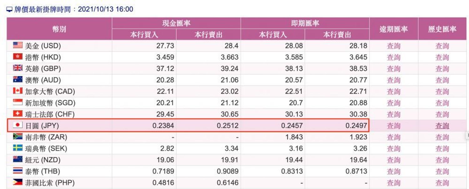 ▼近年來日圓越跌越低,根據台灣銀行日圓現金賣出匯率價,現在已經跌到0.2512,創下2015年8月11日以來6年多來的新低。受到疫情的影響,再加上雙十節連假等因素,日圓相較過去持續貶值,新台幣優於日圓。雖然現在還不能去日本旅行,但以後有出行計畫的話,不妨先換一點日圓,存起來以後再用。