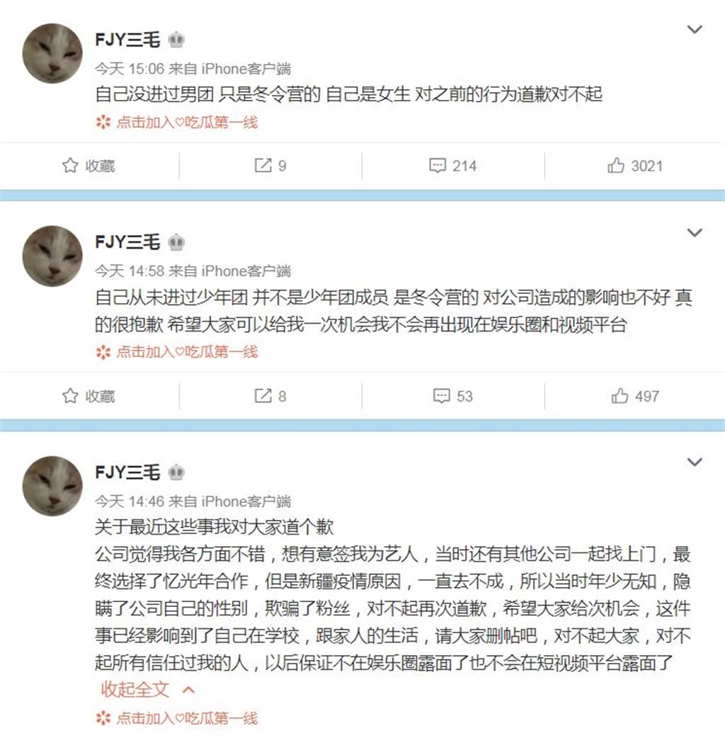 ▼付佳源今年13歲,她發文表示,當初公司覺得她各方面都不錯,有意想簽下她成為藝人。「當時還有其他公司一起找上門,最終選擇了憶光年合作,但是新疆疫情原因,一直去不成,所以當時年少無知,隱瞞了公司自己的性別,欺騙了粉絲,對不起再次道歉。」