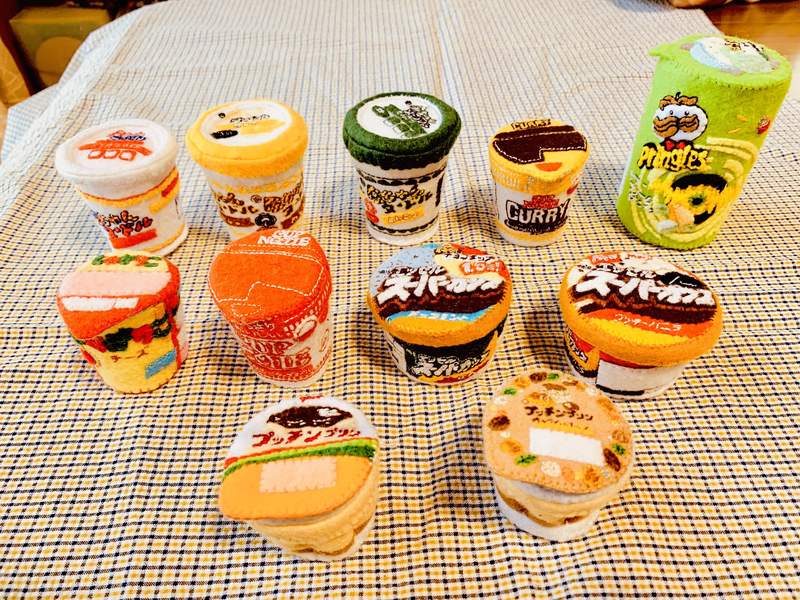 2021年10月19日現在很多零食的包裝設計非常華麗,有人會收集起來加以收藏。日本推友@jin_s0819分享了一組照片,是祖母替自己的孫子縫製的零食玩具。第一眼看去,這些零食就像從盒子裡取出來的一樣,但仔細看看,原來是絨毛玩具!祖母模仿零食外盒還原所有的細節,有點心、泡麵、調味料等等,還原度超級高~