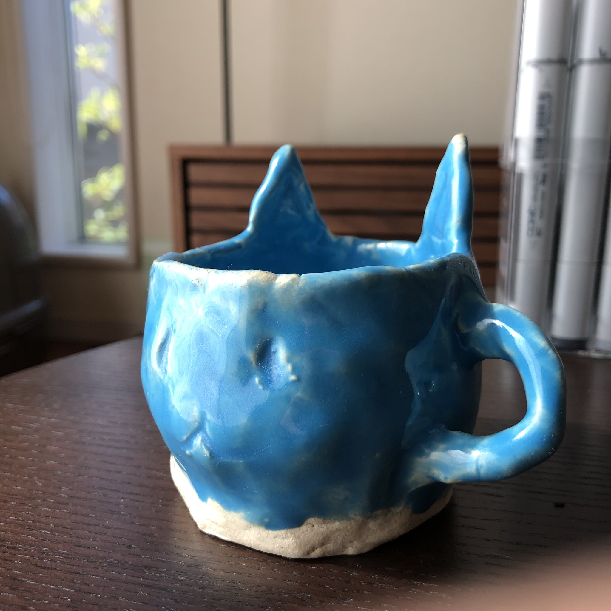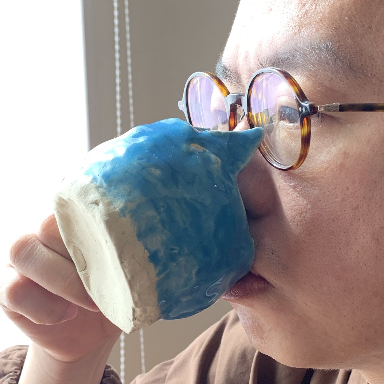 ▼杯子裡還刻上了一隻可愛小貓臉,可以看出女兒真的超用心在做杯子,老爸當然是開心地拿起杯子來喝…