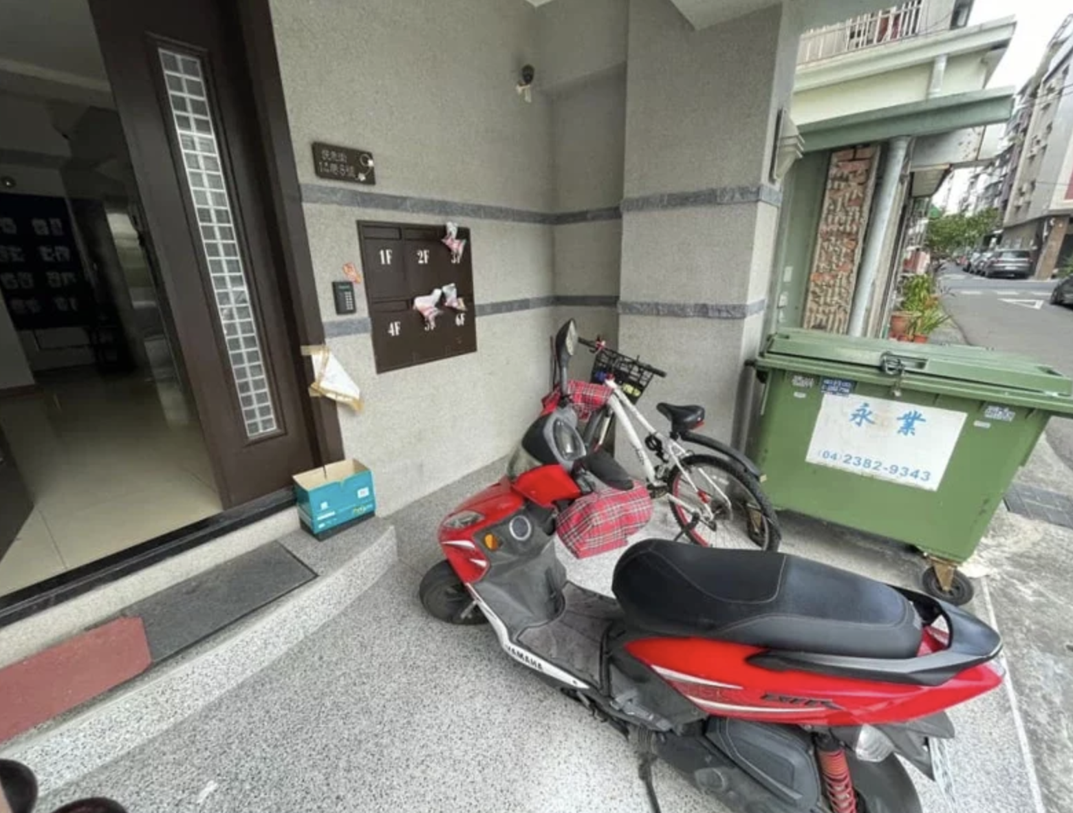 從住戶po出的另一個角度的照片可以看到,門口的地方放著一個小紙箱,不過外觀的顏色更接近水藍色。這位住戶開玩笑說:「住到現在才知道,原來一直以來我都搞錯外送箱了!難怪我有時候點得多都覺得外送箱很擠,原來是我的外送員放錯了,他沒看到大的」。怎麼會有這樣的誤會,誰會把垃圾子母車當成外送箱啊?!