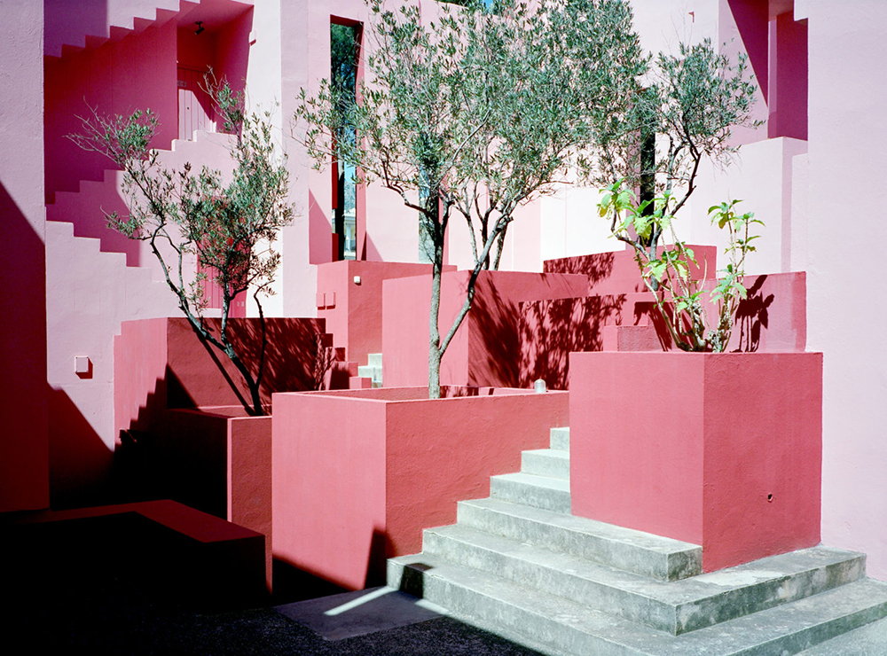▼La Muralla Roja在西班牙語中是「紅牆」的意思,Ricardo Bofill從北非卡斯巴古城(Kasbah)和地中海阿拉伯建築中汲取靈感,將庭院、開放式樓梯與橋樑等伊斯蘭建築的傳統元素融合進來,再加上粉色和藍色的色調,讓這座建築成為永恆的經典。