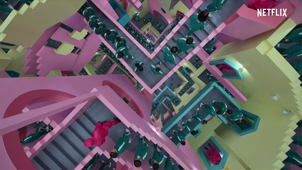 ▼《魷魚遊戲》中的「彩色樓梯迷宮」色彩鮮豔、設計有趣,跟殘酷的劇情形成鮮明的對比。