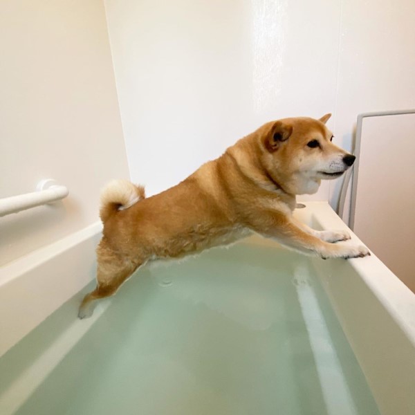 以全身拒絕!柴柴不想洗澡「棒式撐浴缸」 網笑翻:好強的腰力!
