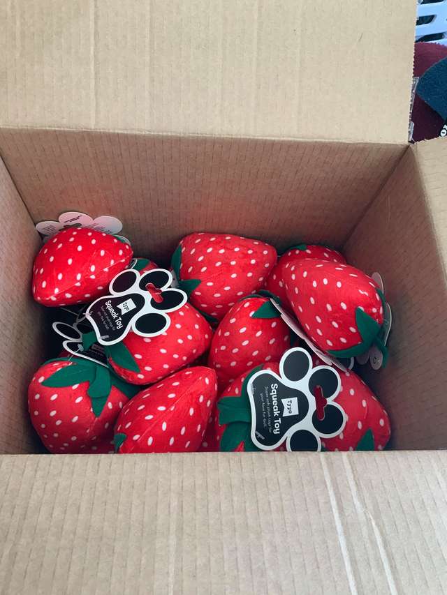 這麼多草莓玩具,Marley可以玩很久。這應該是牠狗生中很珍貴的回憶吧~
