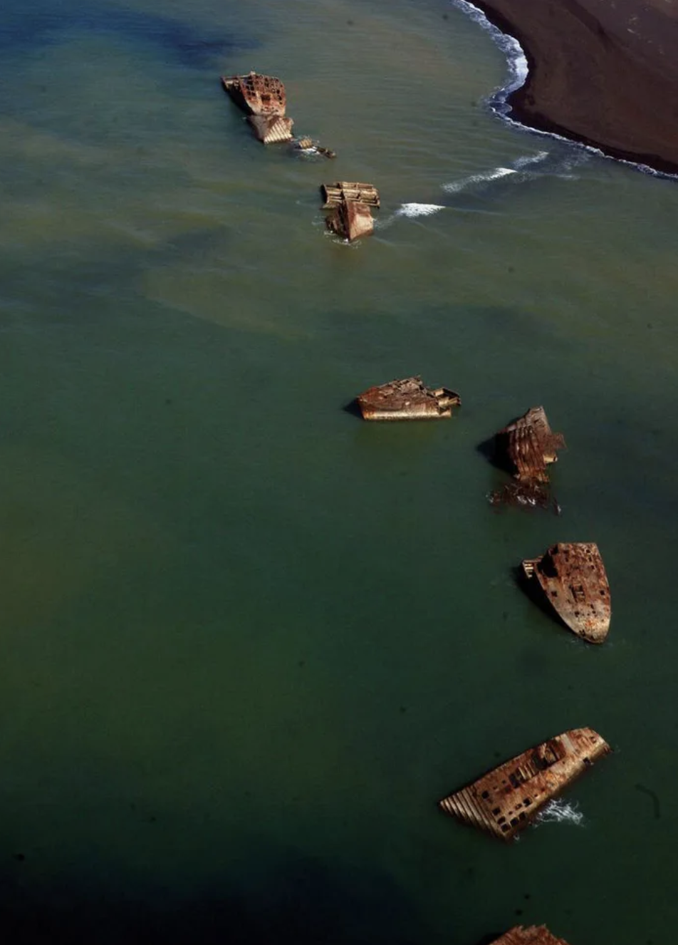 ▼因為海底火山噴發的影響,硫磺島正在持續升高,從空中俯瞰可以發現硫磺島的面積正在不斷擴大,海灘上出現了一艘艘船隻殘骸。