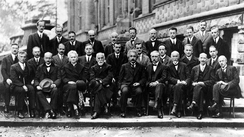 從左至右看,第一排:歐文朗繆耳、馬克斯普朗克、瑪麗居禮、亨德里克勞侖茲、阿爾伯特愛因斯坦、保羅朗之萬、查爾斯古耶、查爾斯威耳遜、歐文理查森
