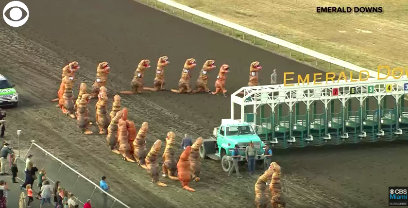 2021年10月22日賽馬比賽不罕見,那恐龍比賽呢?不要懷疑,世界上真的有這麼無厘頭的比賽!去年7月初,美國華盛頓州奧本市(Auburn)舉辦了一場超有趣的賽跑比賽,參賽者都穿著充氣霸王龍裝。不等他們奔跑,只看他們排隊準備進閘門的樣子,大家就笑翻了。