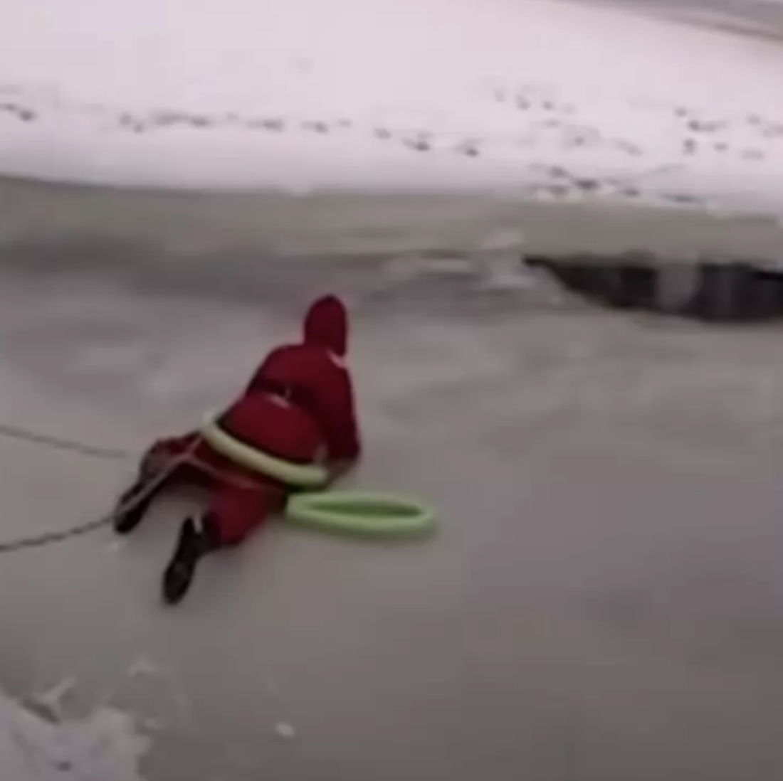 ▼冰面非常薄,很容易碎裂。救援人員將繩子綁在身上,慢慢朝Charlies所在的方向爬去。靠近Charlies後,人們才發現牠用兩隻前爪硬撐在冰面上,大部分身體都泡在冰水中。牠已經搖搖欲墜,隨時都可能掉下去。