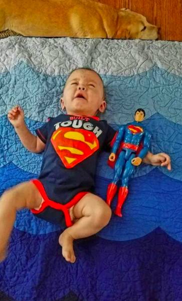 Logan非常喜歡這個超人玩具,他看自己和玩具的對比照時應該也會很驚訝,沒想到自己剛剛出生時那麼小巧吧~