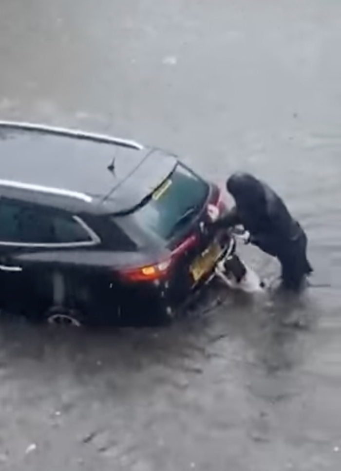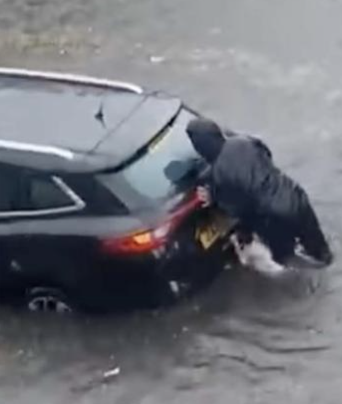 2021年10月28日今年8月中旬,蘇格蘭遭逢豪雨,多地淹水,給人們的生活帶來很多不便。那天當地居民Lori Gillies帶著狗狗Puck在家附近散步,看到一輛車子在路上拋錨,雨水已經淹過輪胎,車上的2名女子看起來有些不知所措。Lori決定伸出援手,幫她們一把,沒想到貼心的Puck也來幫忙~