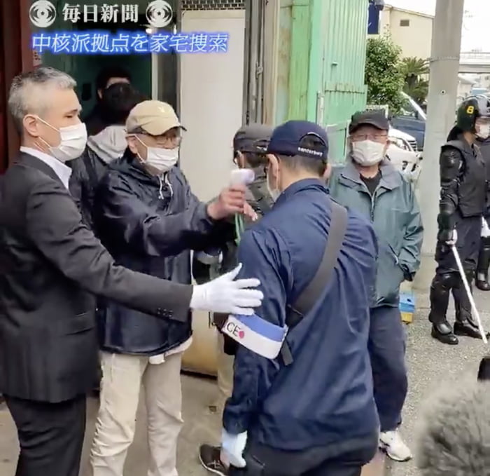 最近一段日本警察突襲激進勢力「中核派」據點的影片在網路上熱傳。當時日本警視廳出動100多名警察對東京江戶川的「中核派」據點實施了強制搜查。剛開始畫風很正常,後來卻看到警察們竟然乖乖排隊,開始接受中核派成員的體溫檢測,那荒誕的畫面很快在網路上引發討論。