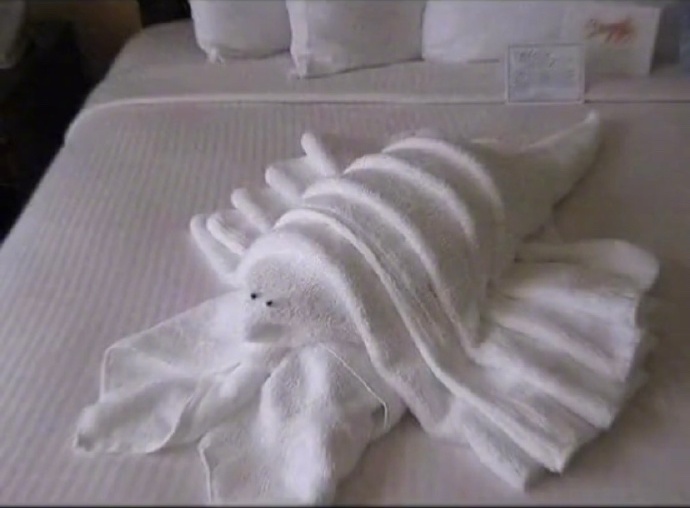 2021年10月29日出入飯店,經常能看到客房裡擺放著用浴巾折疊的可愛小動物,有些手巧的客人退房時也會折疊浴巾,給房務人員留下一份驚喜。最近一位訪客離開飯店後留下的手工作品引起了網友們的關注,大家忍不住表示:「這是猩球崛起!」
