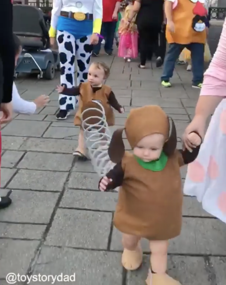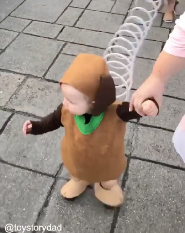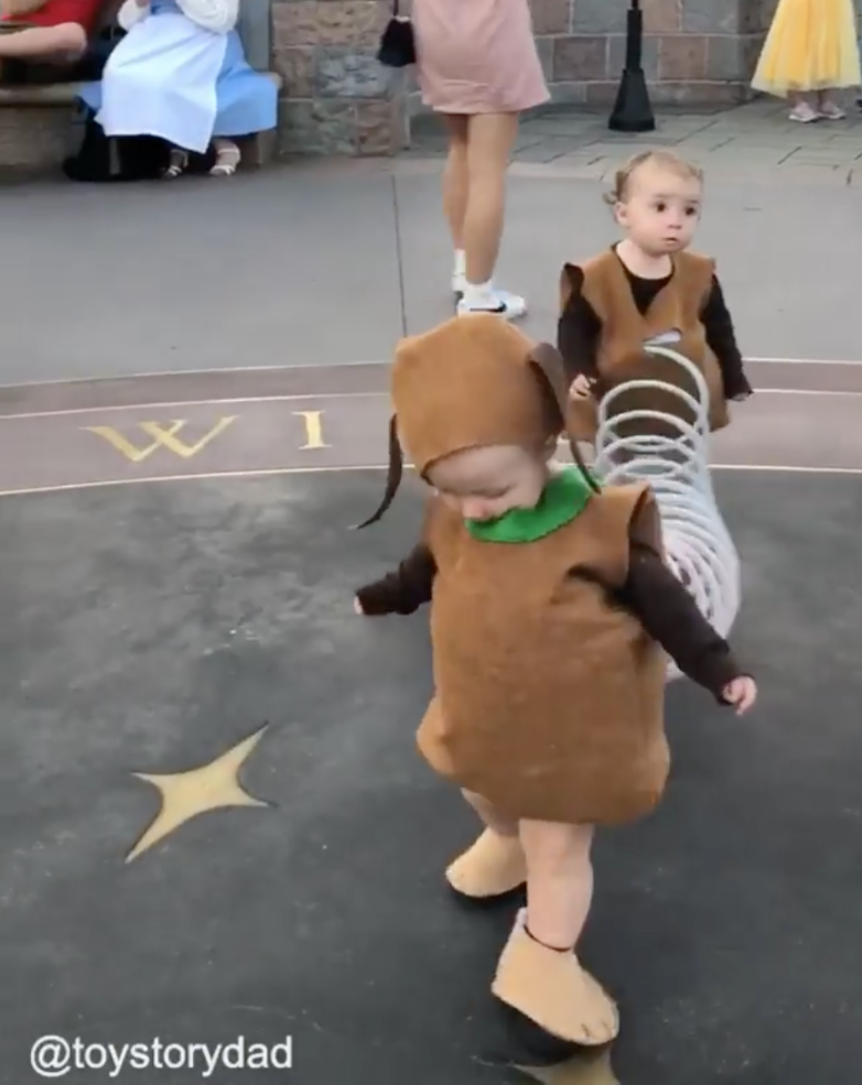 2021年10月29日這會是你今天看過最療癒的影片!外國一名熱愛《玩具總動員》的爸爸Tucker,帶寶寶去迪士尼參加萬聖節派對前突發奇想,用心地幫寶寶Cosplay成「彈簧狗」,他的朋友也很熱情地派出孩子當「尾巴」!兩個萌娃就這樣搖搖擺擺地在園區內走動,吸引了所有遊客的目光。