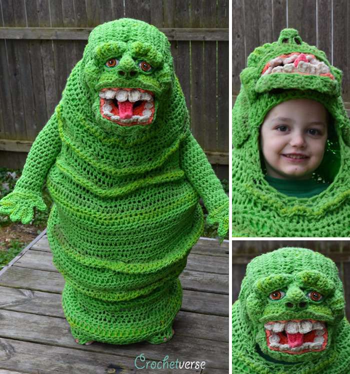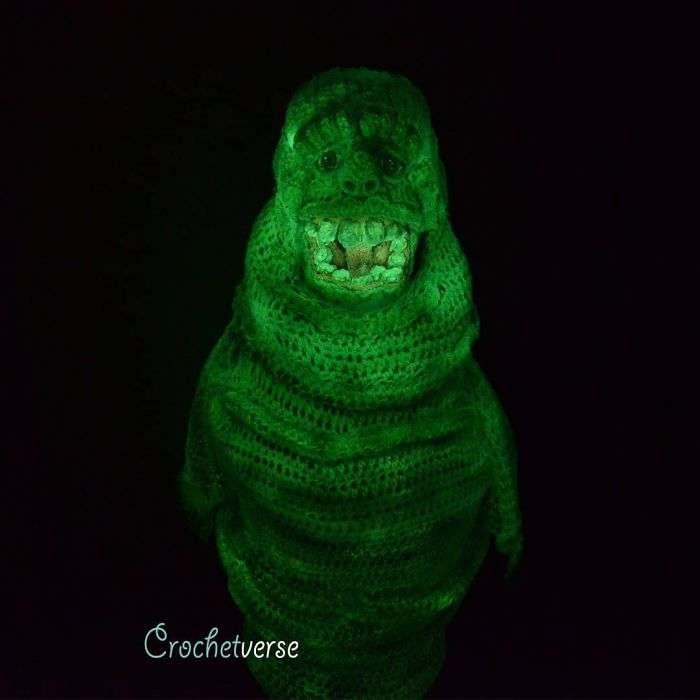 ▼《魔鬼剋星》(Ghostbusters)裡亦正亦邪的角色「史萊姆」(Slimer)。居然連夜間發光模式都能運用到手工針織活裡, 看得我下巴都掉了,衷心佩服~