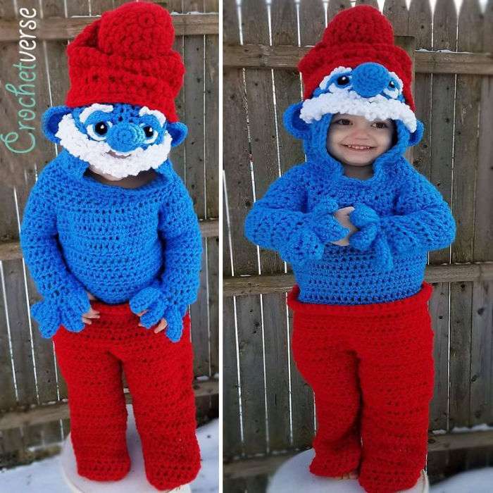 ▼史蒂芬妮說,因為他們居住的地區,每每到了萬聖節時,氣候都比較寒冷,所以這樣的針織服裝便可以大大的提升保暖度,絕對是「不給糖就搗蛋」時超加分的服裝選擇!這套《藍色小精靈》(The Smurfs)不但從頭包到腳,萌度也破錶!
