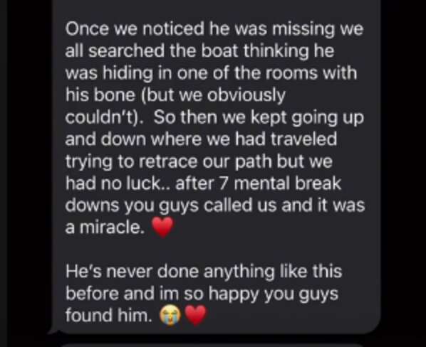 主人跟Zuko團聚之後,忍不住抱著牠大哭起來。他們非常感謝Bryn和她的朋友能伸出援手。現在主人已經給Zuko船上救生衣,以後帶牠出海時也會更加小心,不會再讓這樣的狀況發生了~
