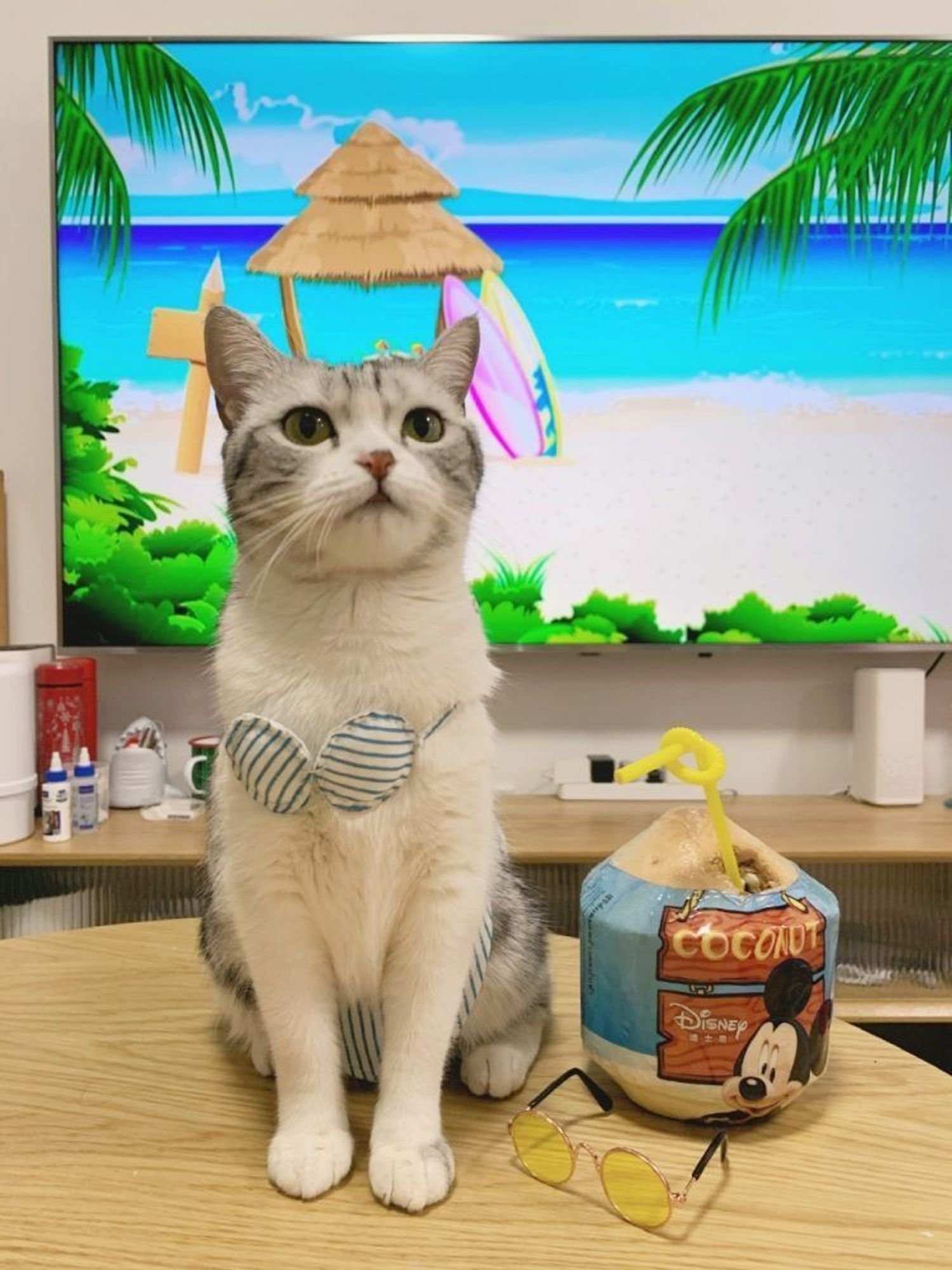 ▼前段時間因為COVID-19的關係不能外出旅行,主人就準備小道具,讓泡芙在家裡享受去海灘玩的感覺。椰子、比基尼、沙灘大海…一眼看去還以為泡芙在沙灘上度假呢。