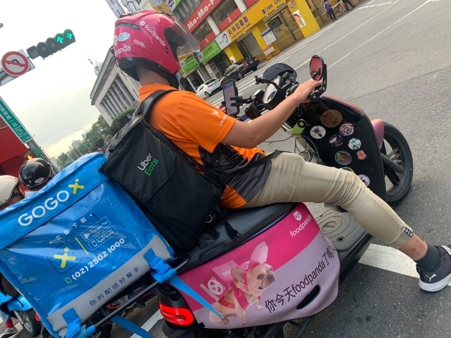 ▼原po在臉書社團「UberEATS台灣」分享照片,並表示自己停紅燈時遇到了一位外送員。從照片中可以看到,這位外送員的機車上有好幾家外送平台的元素。他身穿lalamove「啦啦快送」的制服、肩上是UberEats的外送箱、車後座有GOGOX快遞箱,安全帽和車身還有Foodpanda的LOGO。原po透露,還有一家不用箱子的「跑跑腿」。也就是說,這位外送員同時「5開」,接5家平台的外送單!