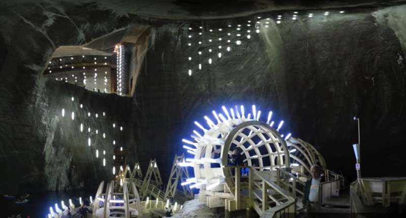 ▼由於 Salina Turda 是由三座礦井組成的,因此非常寬廣宏大,遊客需搭乘透明電梯深入地底37層(112公尺)才能抵達。