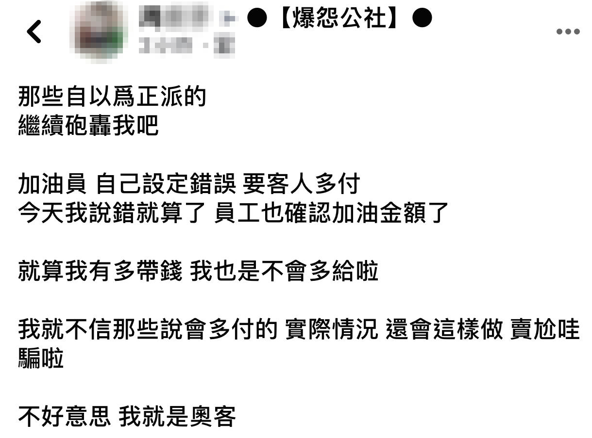 ▼也有加油站員工出來解釋,「做過加油站快一年,有時候真的是機器設定問題,基本上表達出非常不好意思的態度,客人都會自付」;當然也有支持原PO做法的,「當然加油員付」、「我是會看狀況,事前都已經講好金額了,如果自己夠錢且對方初次就會給錢;錢不夠就只會請工讀生自己吸收」、「我覺得有付錢、沒付錢都沒錯啊,憑什麼別人的錯誤要自己買單。」
