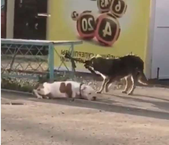▼Dmitriy表示,鬥牛犬的主人進入超商採買,就暫時將愛犬繫在門口。浪浪可能誤會了,以為這隻鬥牛犬也是被主人拋開的,竟走上前用牙齒咬牽繩,想要解救牠。牽繩被解開後,浪浪還咬著繩索另一端,試圖把鬥牛犬帶走。