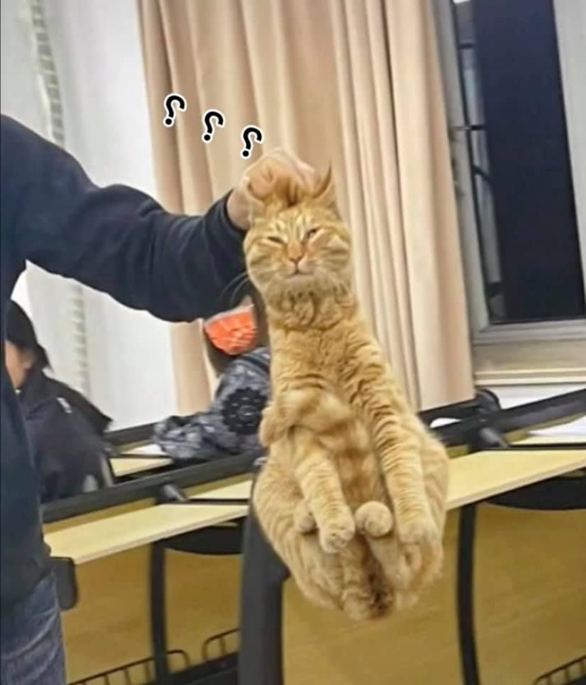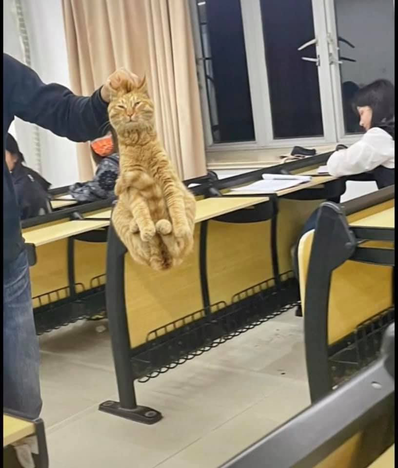 ▼老師將貓咪拎起帶出教室,貓咪的反應非常好笑。牠的四隻腳和尾巴都縮起來,尤其是臉上的表情,看起來困惑又無奈。牠可能是在睡夢中被拎走的,所以還沒有反應過來。原po開玩笑說:「班上唯一認真聽課的被帶走了!」