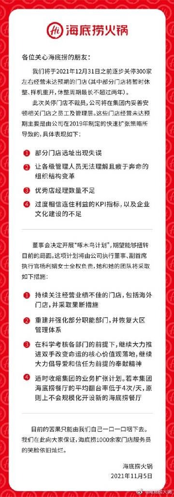 中國餐飲巨頭「海底撈」短短2年半時間就開1151家新門店,瘋狂擴張卻導致經營表現不佳。11月5日,海底撈發公告說,決定在12月31日前,逐步關停300家左右客流量相對較低及經營業績不如預期的海底撈門店。其中部份門店將暫時休整、擇機重開,休整周期最長不超過兩年~