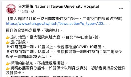 指揮中心表示,希望藉由台大醫院的預約系統,讓願意接種疫苗的人數再增加,並提升民眾的施打意願。同時也讓其他醫院知道,用相同的方式為民眾預約及施打疫苗是沒有問題的~