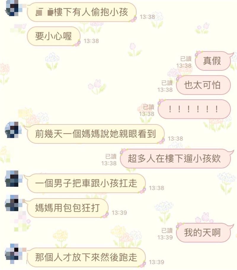 最近「學校周遭有陌生人抱走小孩」、「陌生人隨機抱兒童」等訊息在案發社區大樓、地方家長群組瘋傳。有人表示親眼看到一名男子把車和小孩扛走,媽媽用包包狂打,那名男子才放下孩子跑開。當地家長都非常緊張,警方得知後不敢大意,立刻調閱監視器查看情況。