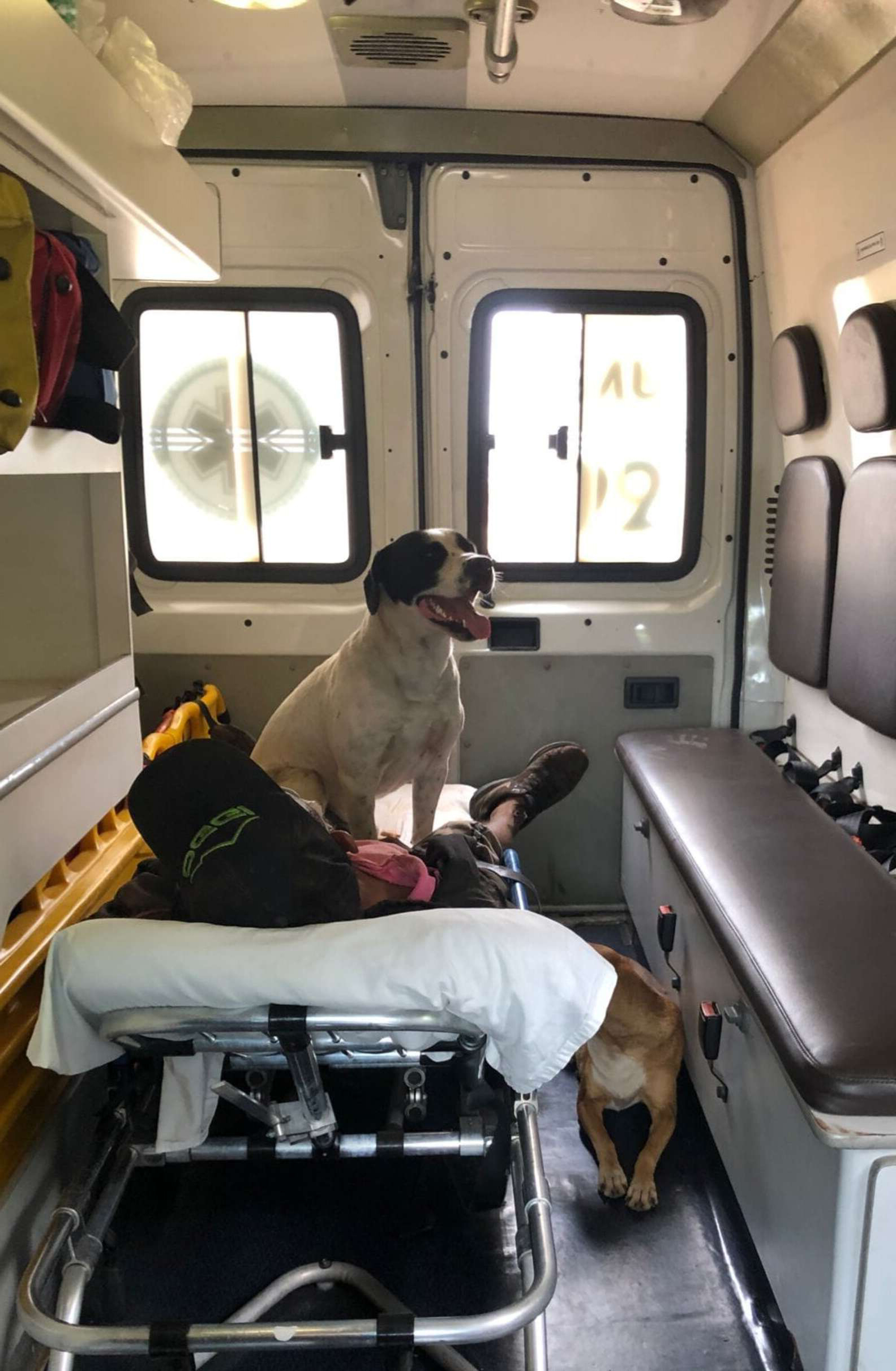 ▼護理人員Patricia Iolanda表示,José倒在地上抽搐時,2隻狗狗就守在他身邊,不肯讓醫護人員接近。後來醫護人員試著卸下狗狗們的心防,才順利將José抬上救護車。他們擔心狗狗們會追著救護車跑,就決定讓狗狗們坐上車,陪著José一起去醫院。