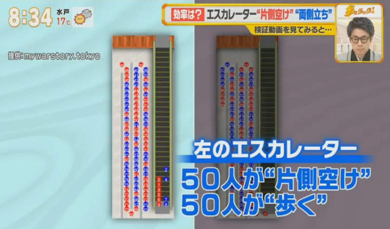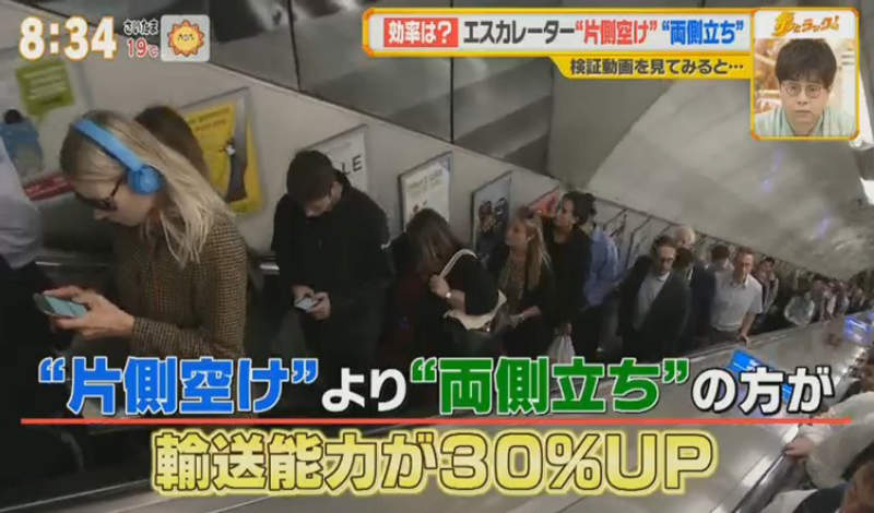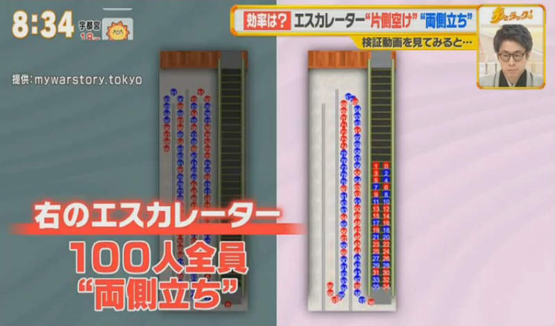 ▼實際上實驗發現,手扶梯兩邊站人會比單側站人的效率提升30%。