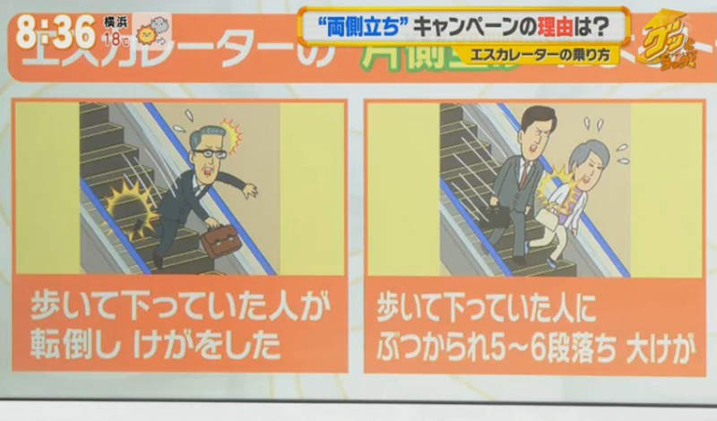 ▼這一實驗計算的是「整體效率」,但現實中乘客們更加重視「自己的效率」,所以不可能像實驗中那樣,站在手扶梯兩邊。日本常見的手扶梯意外包括4種:自己摔倒、被擦身而過的人碰撞摔倒;