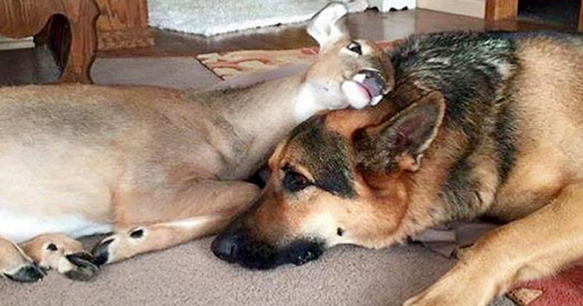 ▼Sarge對野生動物非常友善,尤其是對馬麻帶回家的小鹿格外溫柔。牠自願承擔起父親的責任,像保鑣一樣時刻陪伴在小鹿身邊。幾年前,Cheryl將一隻受傷的小鹿帶回家,並給牠取名為Buckwheat。Sarge一下子就愛上了這隻小鹿,寸步不離地守在牠身旁。Buckwheat練習走路時,牠也會耐心陪伴,就像在鼓勵牠一樣。