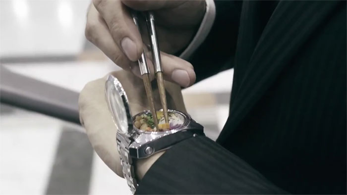 ▼只有美食,沒有餐具,該怎麼吃呢?Bento的腕錶便當盒配備了筷子。按下按鈕,伸縮筷子就會彈出來,你可以一邊走一邊享用美味的餐點。