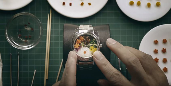 ▼一切準備就緒後,袖珍藝術專家會將食材放進腕錶中,完成最後的擺盤。在大家的協作下,一個微型的便當盒順利完成啦~