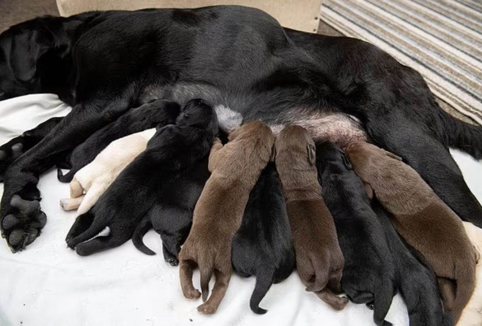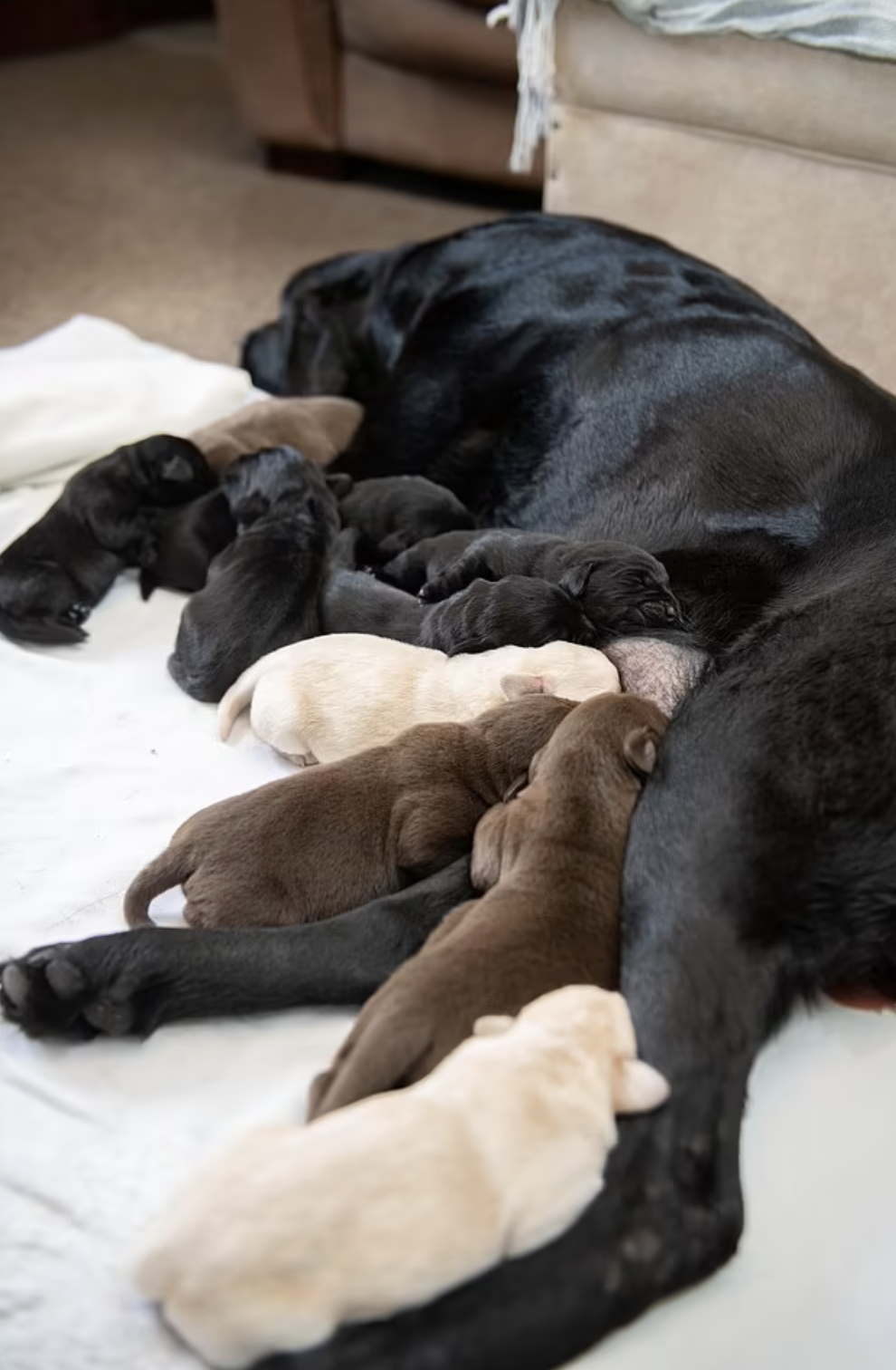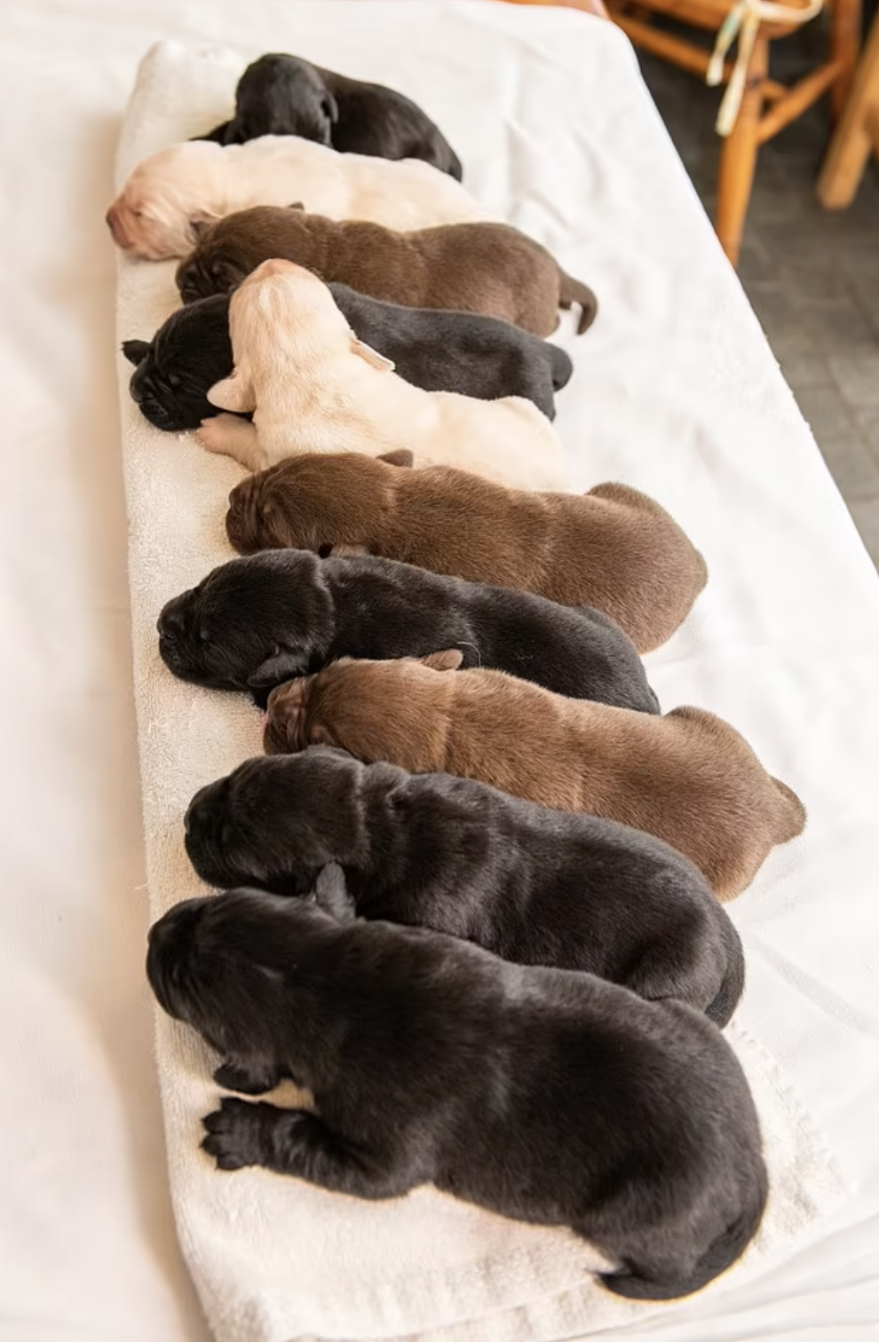 去年10月,英國一隻4歲的黑色拉布拉多犬Zola生下一窩10隻小狗。令人驚奇的是,這10隻狗狗罕見地出現了3種顏色,分別是2隻黃色、3隻巧克力色和5隻黑色。Zola的主人從2006年就開始進行實驗繁殖計劃,希望母拉布拉多犬一窩可以生下多種顏色的小狗,現在終於成功了~