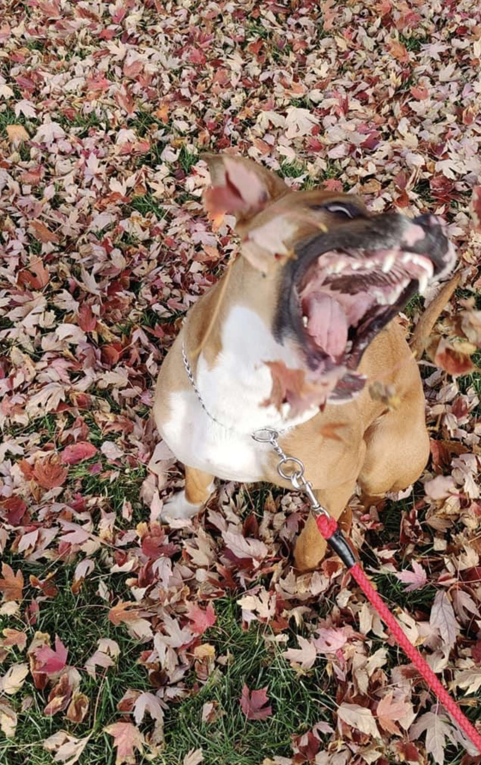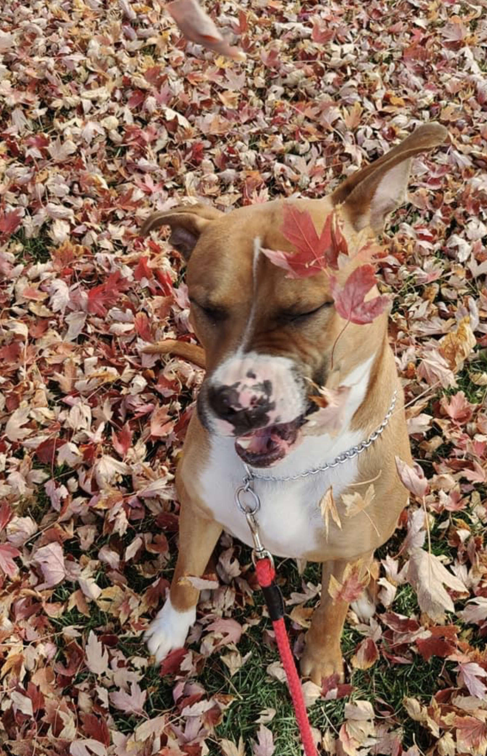 ▼Amanda說:「牠精力充沛,對一切都很好奇。牠最喜歡散步,有時候還會興奮地蹦蹦跳跳、轉圈圈。」那天Amanda帶Max外出時,發現Max對落葉非常好奇,牠還試著去咬那些剛剛從樹上落下來的黃葉。