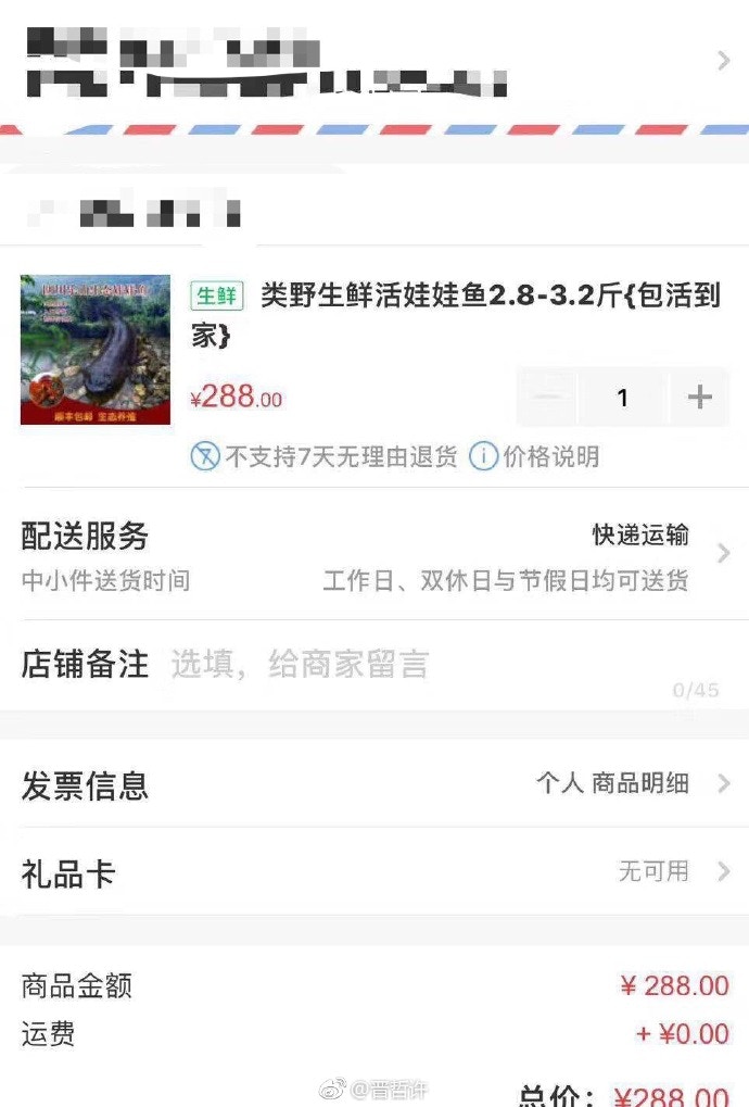 ▼除此之外,還有一斤「生鮮包活」娃娃魚靜靜躺在「待發貨」一欄中。