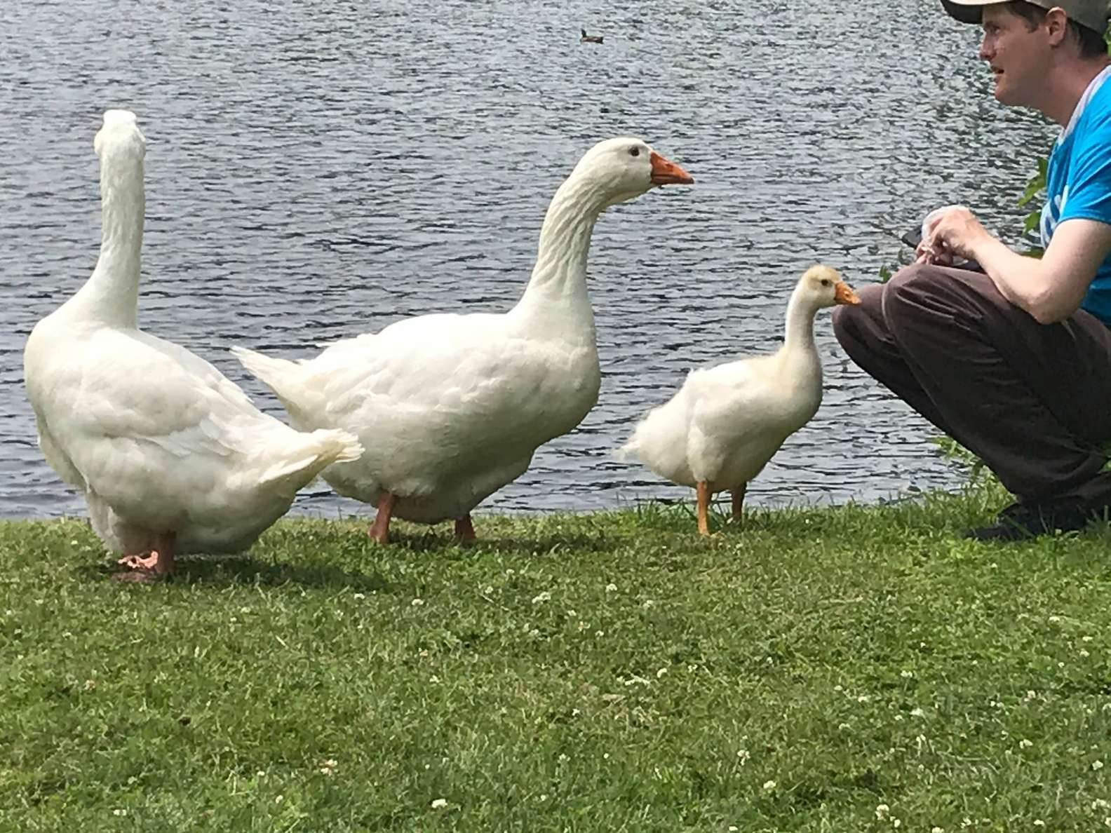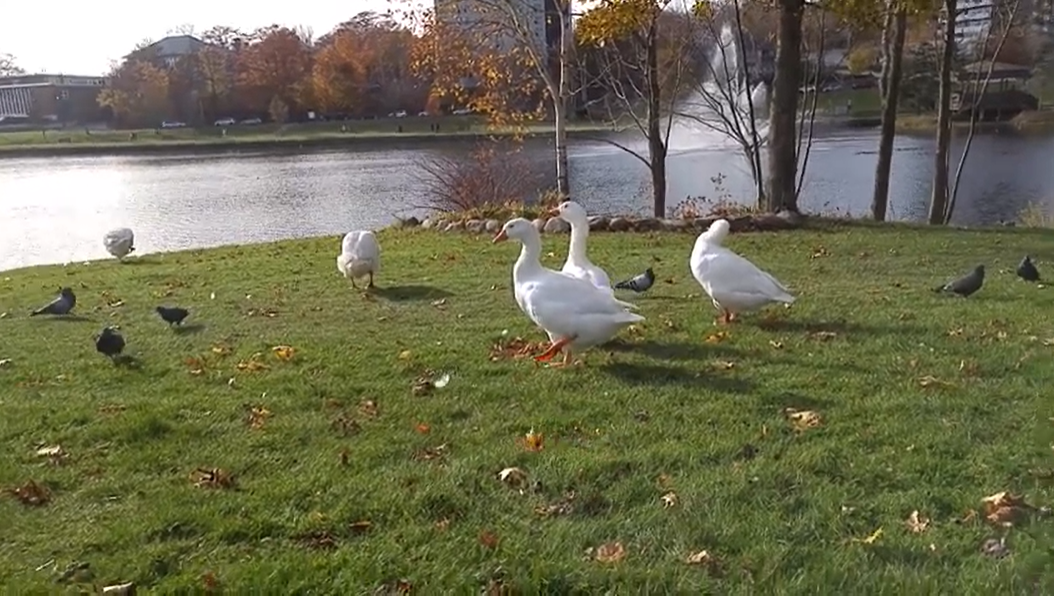 ▼Doug的鵝朋友一共有8隻,牠們住在Sullivan's Pond人工湖休閒區。Doug給每一隻鵝朋友都取了名字,他每次到公園都會將鵝朋友的名字點過一輪,就像在跟牠們招呼。鵝朋友們逐漸跟Doug熟悉起來,也很信任他。