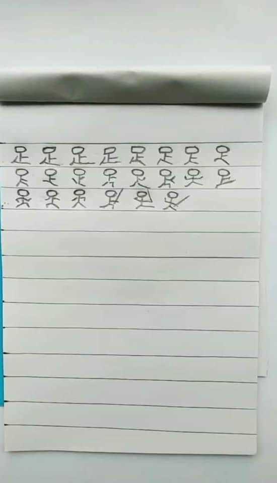 兒子寫「足」逐漸變成「功夫小人」 網友大笑推:別埋沒他的創意!