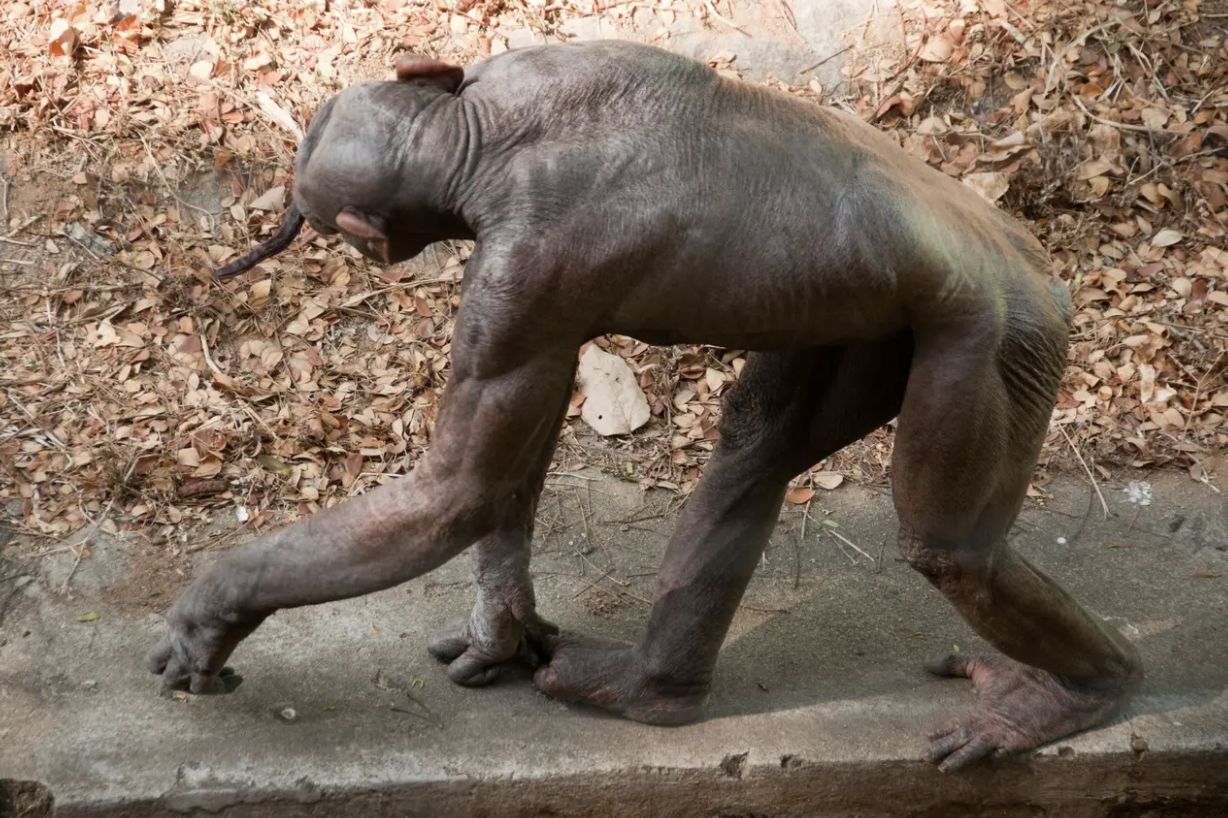 ▼從影片中可以看到,無毛猩猩與普通的猩猩生活在同一空間中。牠們有時趴在地上吃草,有時跳起來抓住繩子盪來盪去,還會透過咆哮威嚇對手、展示自己的力量,確保自己在種群中的地位。只看無毛猩猩的身體,因為沒有毛髮的關係,渾身結實的肌肉展露無遺。