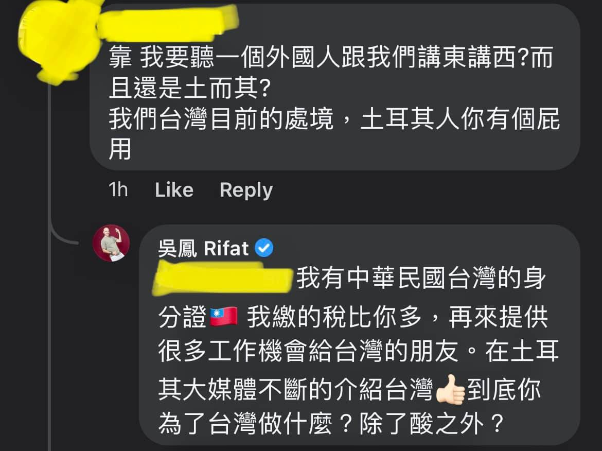 ▼吳鳳在臉書貼出酸民的留言截圖。只見那名酸民說:「靠,我要聽一個外國人跟我們講東講西?而且還是土耳其?我們台灣目前的處境,土耳其人你有個屁用!」對此吳鳳直接回嗆:「我有中華民國台灣的身分證,我繳的稅比你多,再來提供很多工作機會給台灣的朋友。在土耳其大媒體不斷介紹台灣,到底你為了台灣做什麼?除了酸以外?」