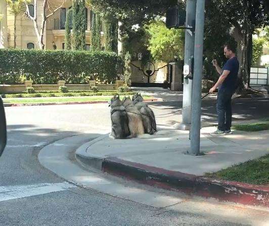 ▼一位網友開車途中,遠遠看見三隻哈士奇並排蹲在路口,身後是牽著牠們的主人,看起來像是在等人,主人正在玩手機,三小隻就靜靜的蹲著一動也不動。