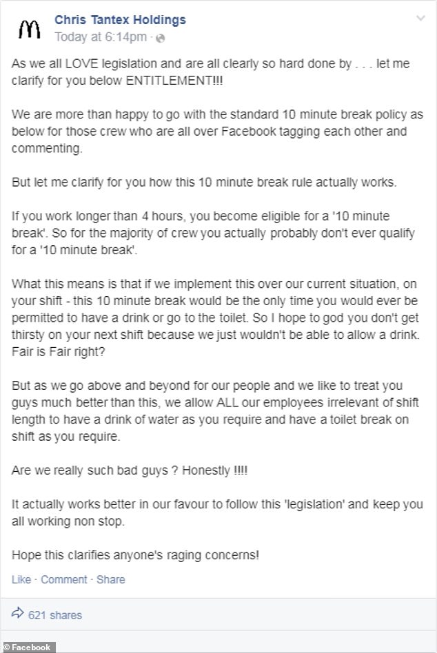 2021年11月20日今年8月,澳洲昆士蘭(Queensland)麥當勞經銷商Tantex被指剝奪員工的休息時間,被法院勒令向一名前員工支付1000澳元(約台幣2萬元)的賠償金和800澳元的薪水(約台幣1萬7千元)。這名前員工叫Chiara Staines,她於2017年5月到2019年6月在一間麥當勞門市工作期間,竟只有3次長約10分鐘的帶薪飲水休息時間。