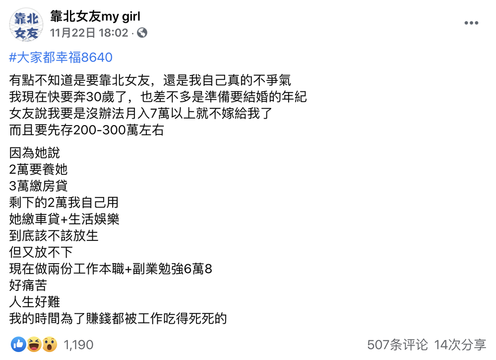 ▼原po的心情很複雜,他開頭就寫道:「有點不知道要靠北女友,還是我自己不爭氣。」他來到適婚年齡,但女友卻表示無法月入7萬就不結婚,還要他的存款在200到300萬。