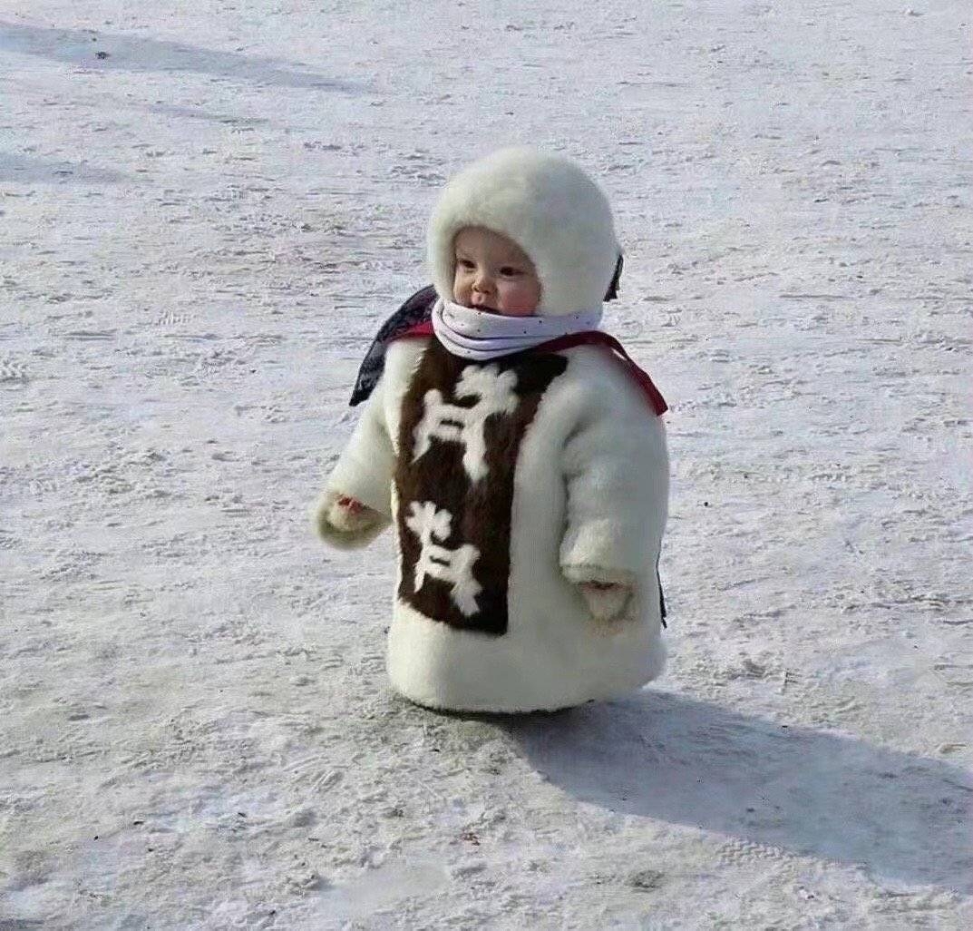 ▼寶寶的手被長長的袖子包住,腳上穿上保暖的毛毛靴子,整個人只有小臉蛋露在外面。他們穿得這麼暖和,直接踩在雪上也不會覺得冷,還能在寒冷的戶外開心玩耍。遠遠看去,這些寶寶就像一顆顆會走路的毛毛湯圓。