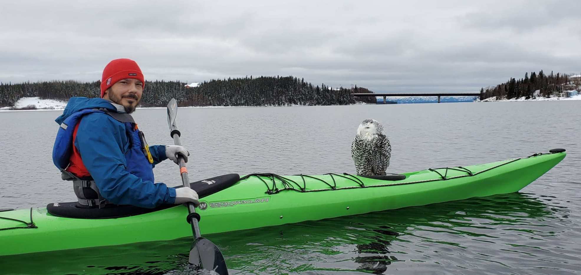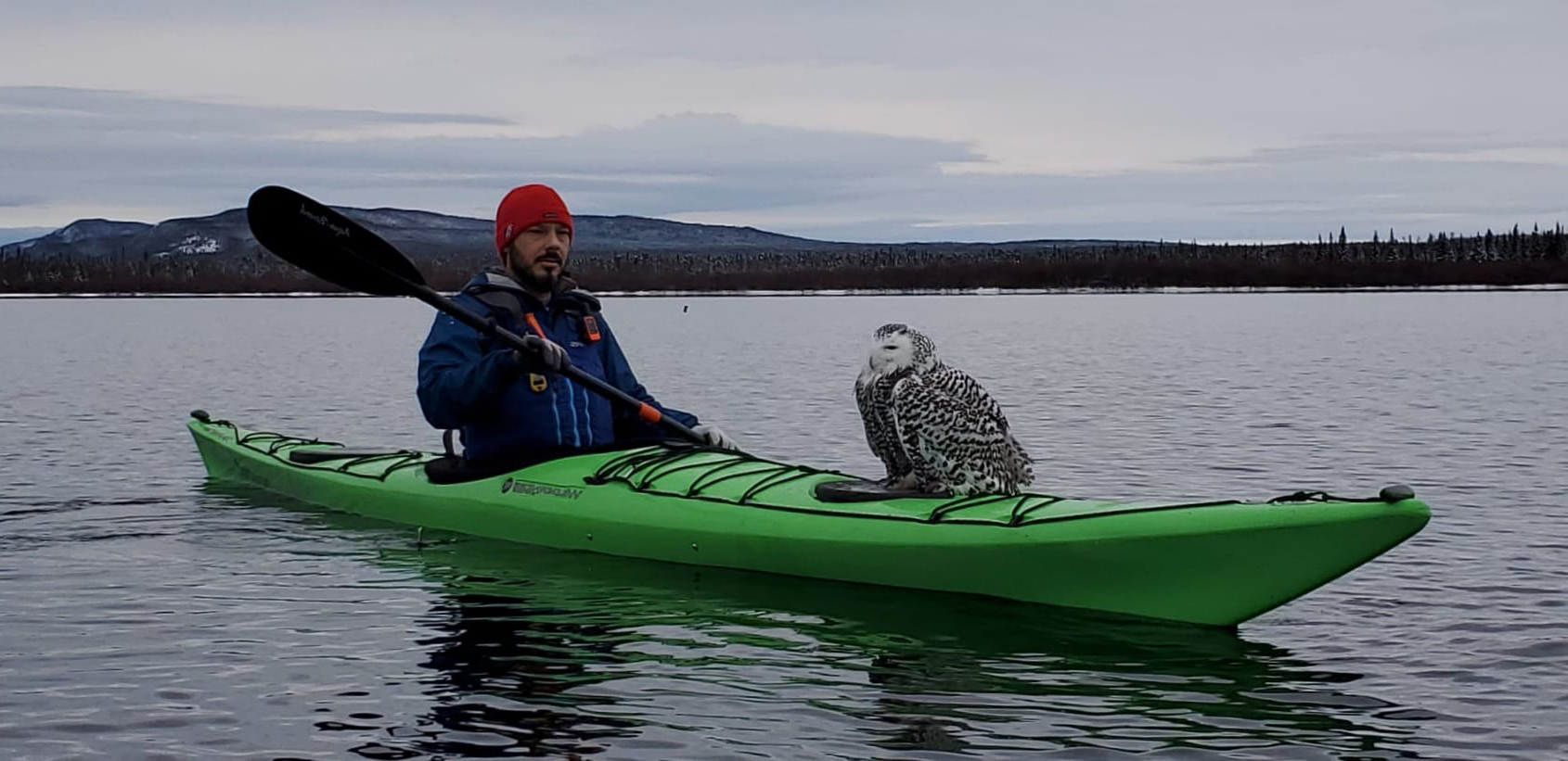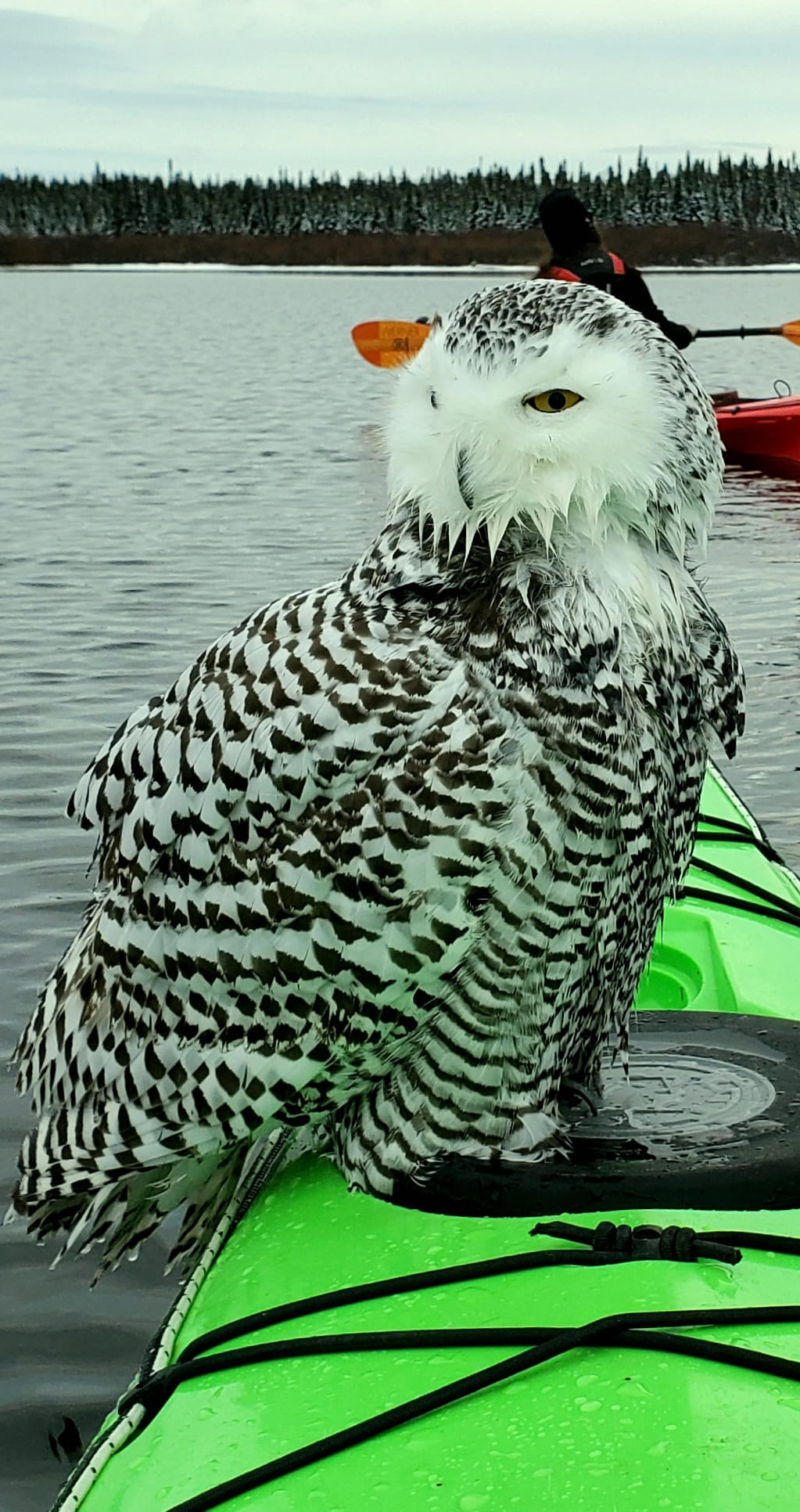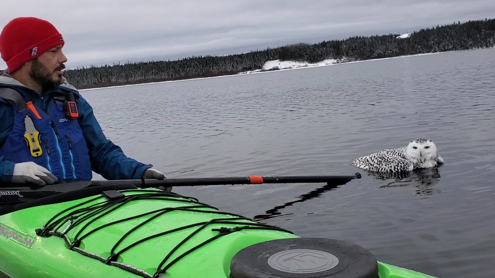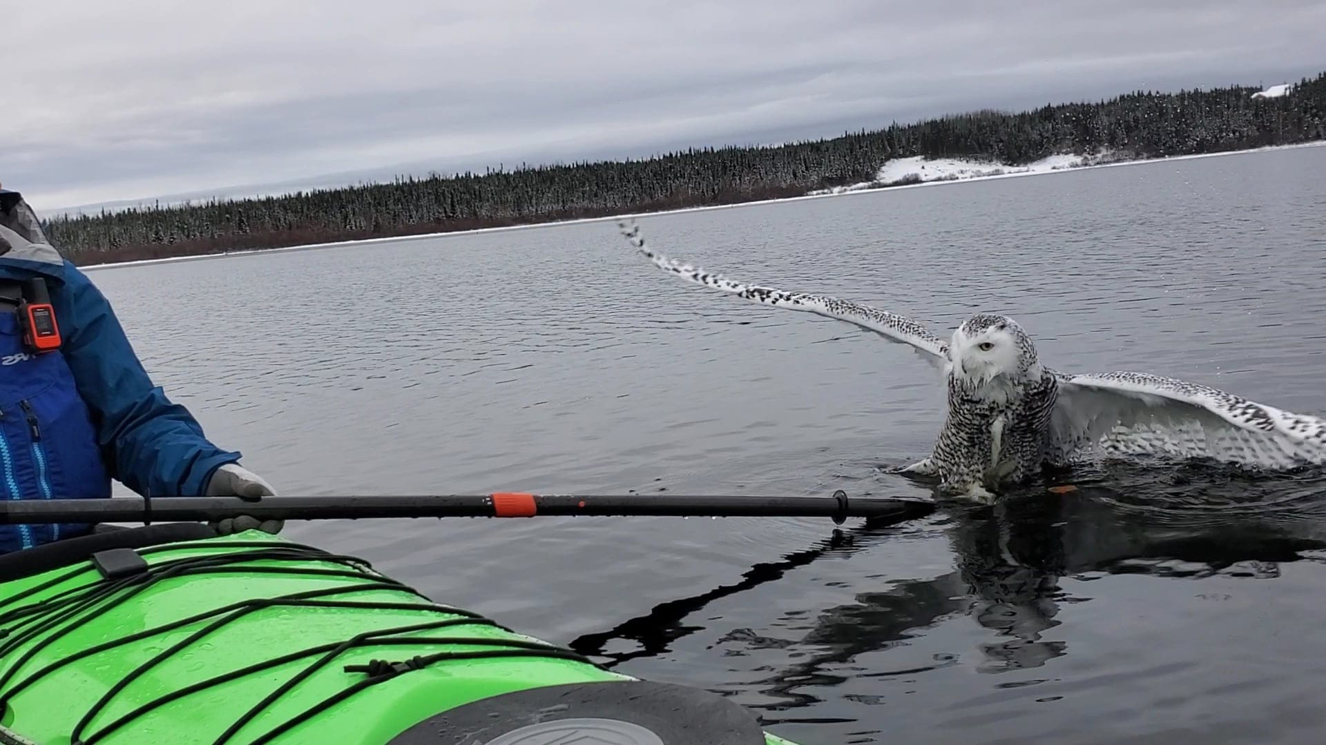 ▼當時Billy和Kara在North West River河面划獨木舟,突然看到一隻白色的雪鴞遭一群烏鴉圍剿。雪鴞寡不敵眾,又無處可逃,被烏鴉攻擊後掉入水中。Kara認為雪鴞一定落在附近,於是跟Billy趕緊去尋找。大約10分鐘後,他們發現了在河面上載浮載沉的雪鴞。